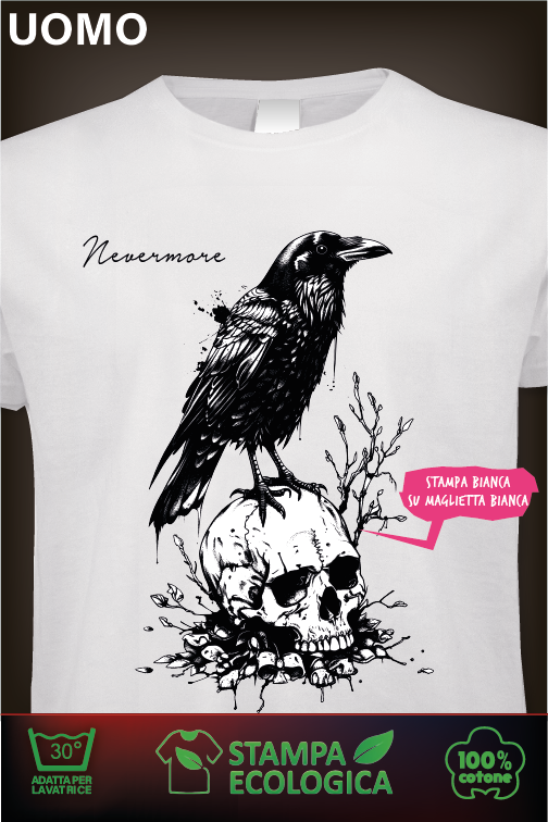 è realizzata in cotone 100% ecologico con stampa durevole e sostenibile. Il design mostra un corvo nero posato su un teschio, un’immagine cupa e intensa che richiama atmosfere gotiche e dark.