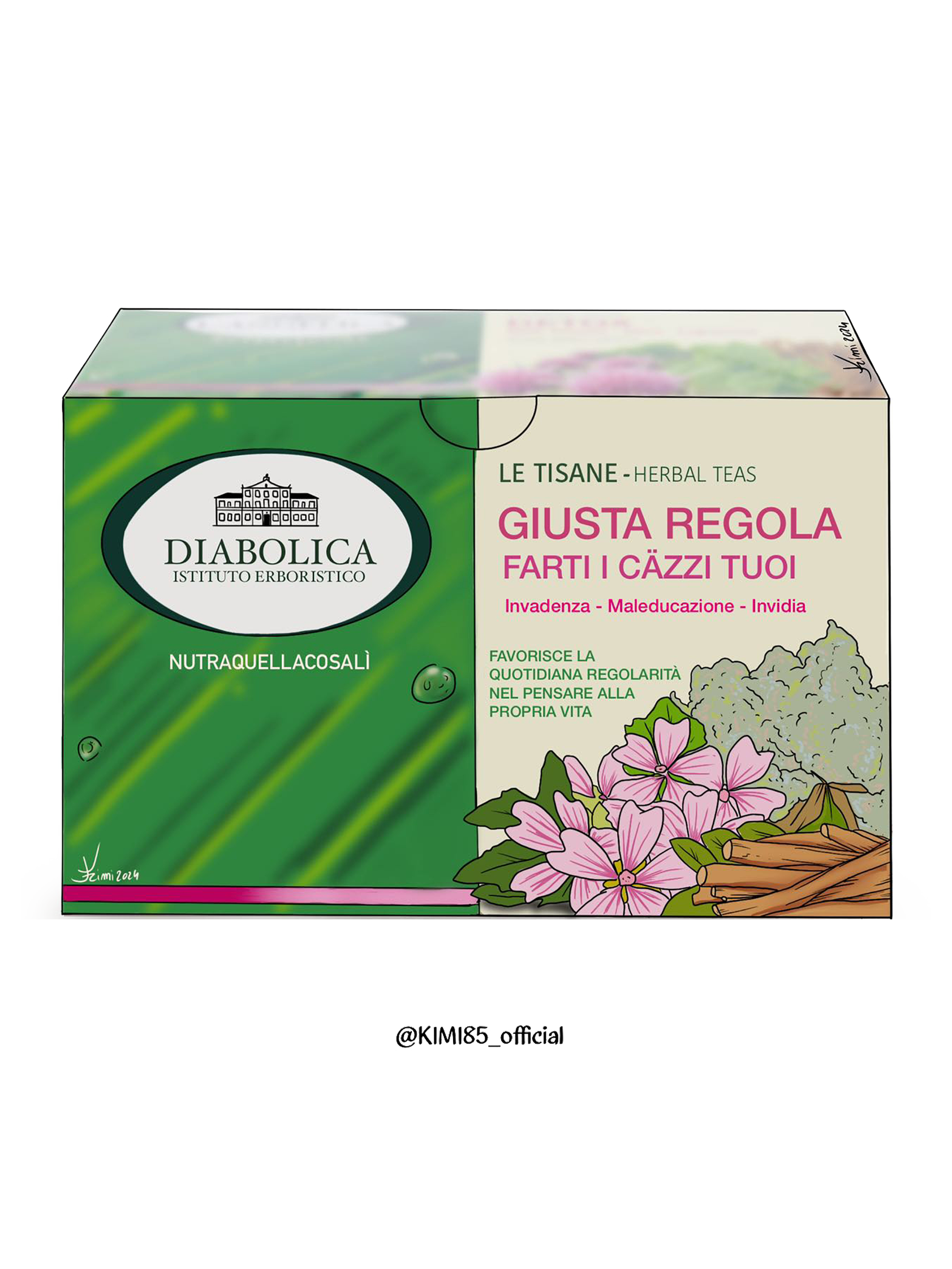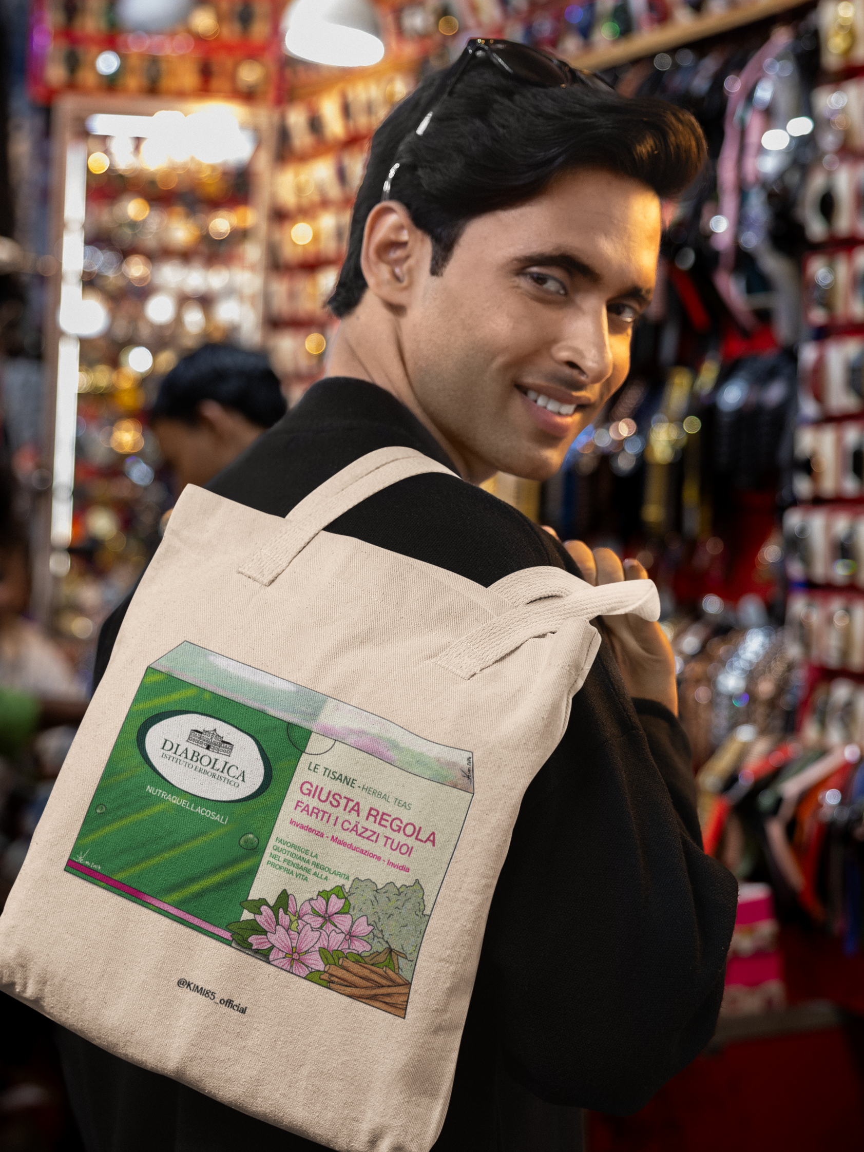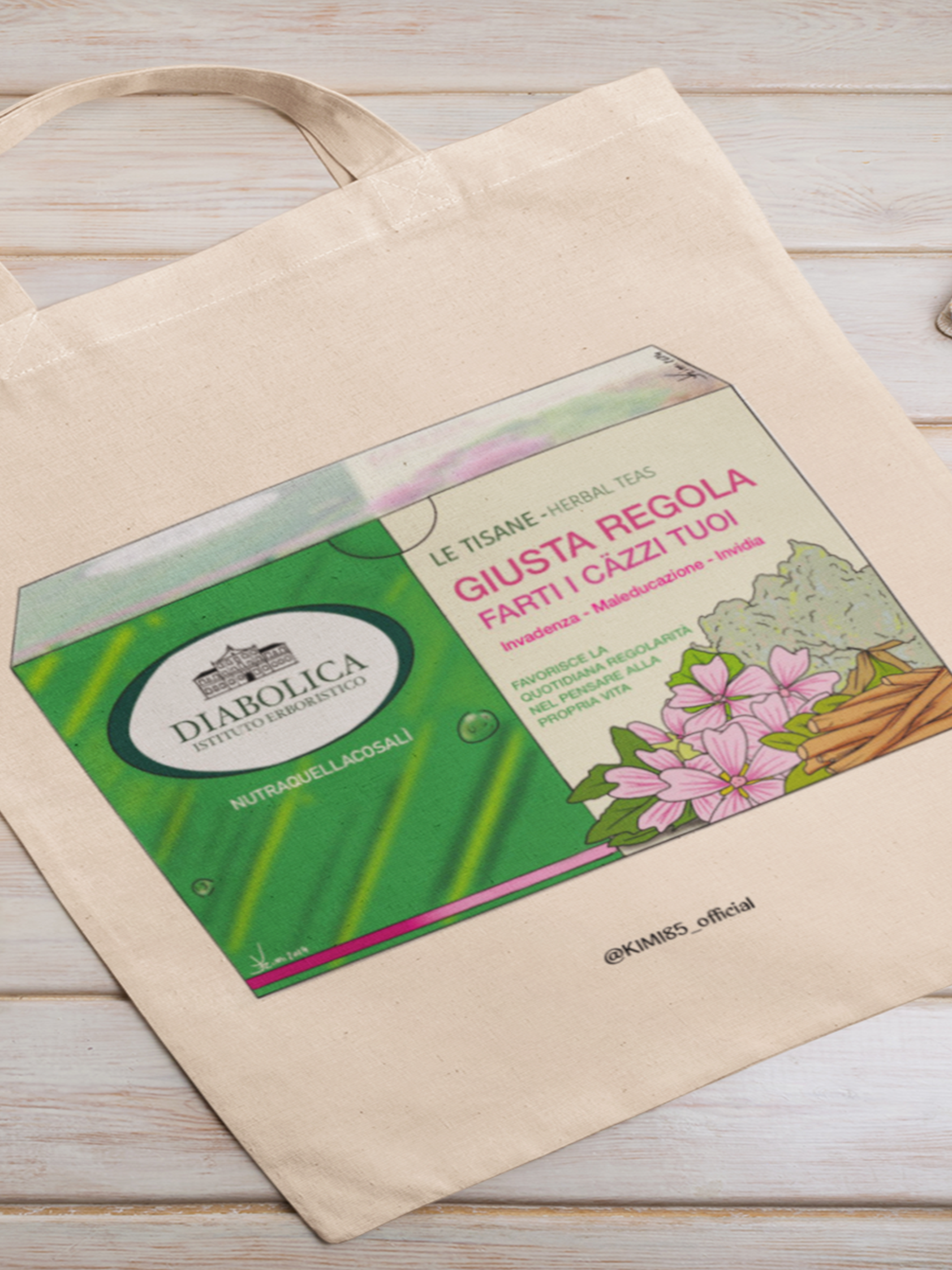 La Shopper Kimi 85 è il risultato di un'esplosione creativa che sfida le convenzioni della moda. Immagina una stampa di una tisana che non è solo una tisana, ma un manifesto di ironia e sarcasmo!